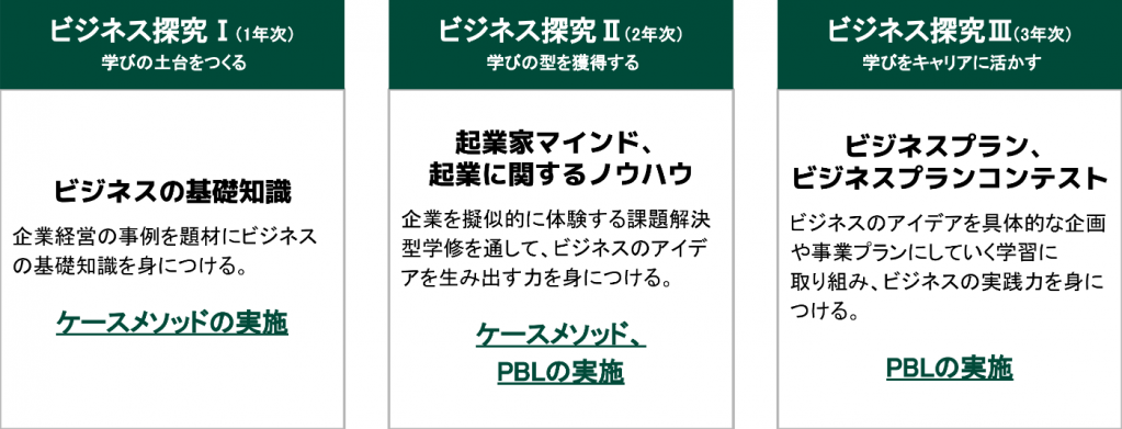 実際に起きた経営上の事例を教材として問題を分析し、討議しながら自らがリーダーとなって解決策を導く「ケースメソッド」や、生徒自らが課題を発見し、協働して解決していく「PBL(課題解決型学習)」を柱とした教育課程を開発し、導入することで「主体的・対話的で深い学び」を実現することを目標としています。このプログラムにより、「ビジネスの現場で新たな価値を生み出すことのできる創造力豊かな人材」の育成を目指します。