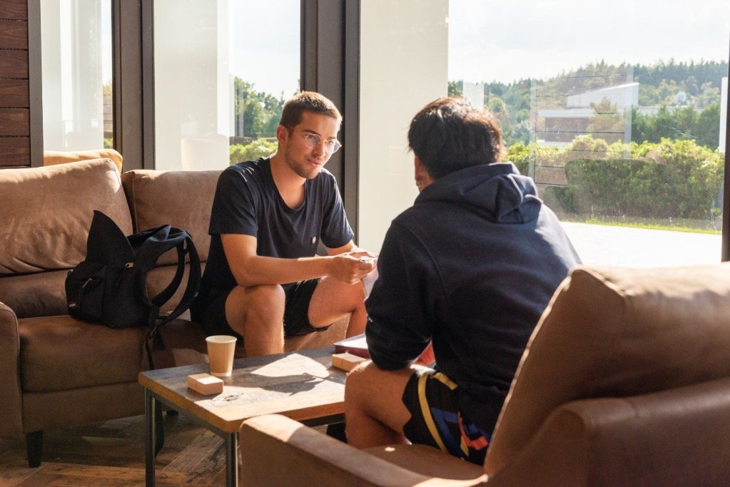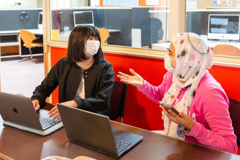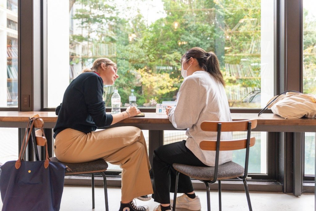 2014年に27組54名から始まったこのプログラムは、2020年の新型コロナウイルス感染症の影響により多くの留学生が日本に入国できない状況の中でも、オンラインを活用して継続して行われてきました。今期のランゲージ・エクスチェンジ・プログラムは、過去最高の56組112名の留学生と在学生が参加してスタートしました。図書館やカフェテリア、ラウンジなど、キャンパス内のさまざまな場所で、一緒に語学学習したり交流をしているペアの姿が見られます。