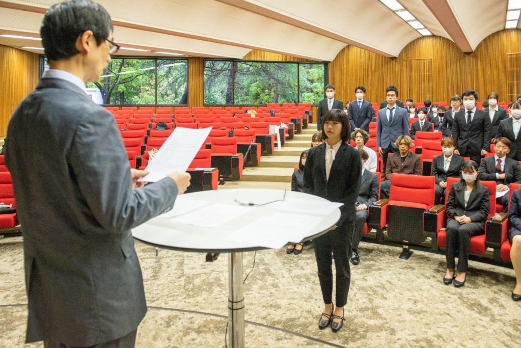 2023年6月12日(月)、日進キャンパスにおいて2023年度前期奨学生認定式が執り行われました。前期奨学生は創立者奨学金[半年額100,000円]20名、学長奨学金[半年額50,000円]36名、同窓会奨学金[年額100,000円]12名、学修奨励生[年額600,000円]2名・[年額300,000円]8名、スポーツ・文化活動奨励生[年額300,000円]2名、国際バカロレア(IB)奨学金[年額300,000円]1名、国際寮奨励生奨学金4名、国際寮奨学金116名の合計201名が採用されました。昨年度から継続の奨学生と合わせると2023年度前期奨学生は延べ443名となり、昨年度前期413名を大きく上回る採用者数となっています。