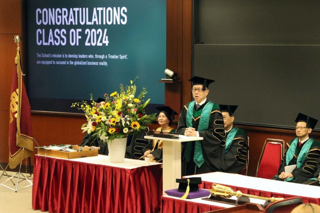 式典では、まず初めに商学部学部長である小野裕二教授から卒業生一人ひとりに学位記が授与され、その後、本学ビジネススクール研究科長である横山教授より卒業生へ祝辞が贈られました。