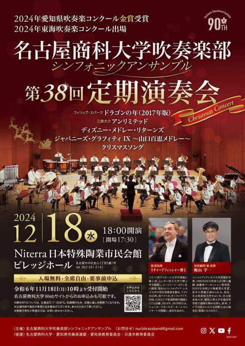 名古屋商科大学吹奏楽部は技術顧問兼指揮者の梶山宇一先生のもと、来る12月18日(水)に「Niterra 日本特殊陶業市民会館ビレッジホール」にて『Christmas Concert』と題し第38回定期演奏会を開催いたします。演奏会では梶山先生の恩師でもあり、コンコルディア・シカゴ大学の常任指揮者を務め、世界各国で客演指揮や講師としても活躍されるリチャードフィッシャー博士を客演指揮としてお招きし、この1年間の集大成にふさわしい演奏会をお届けいたします。