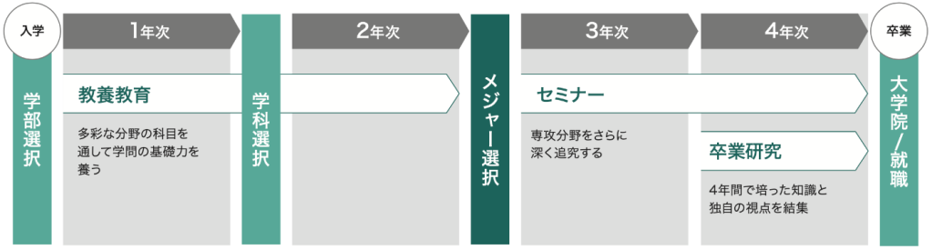 幅広いメジャーから1つを選択して、対応するセミナーに所属しながら卒業研究を行います。