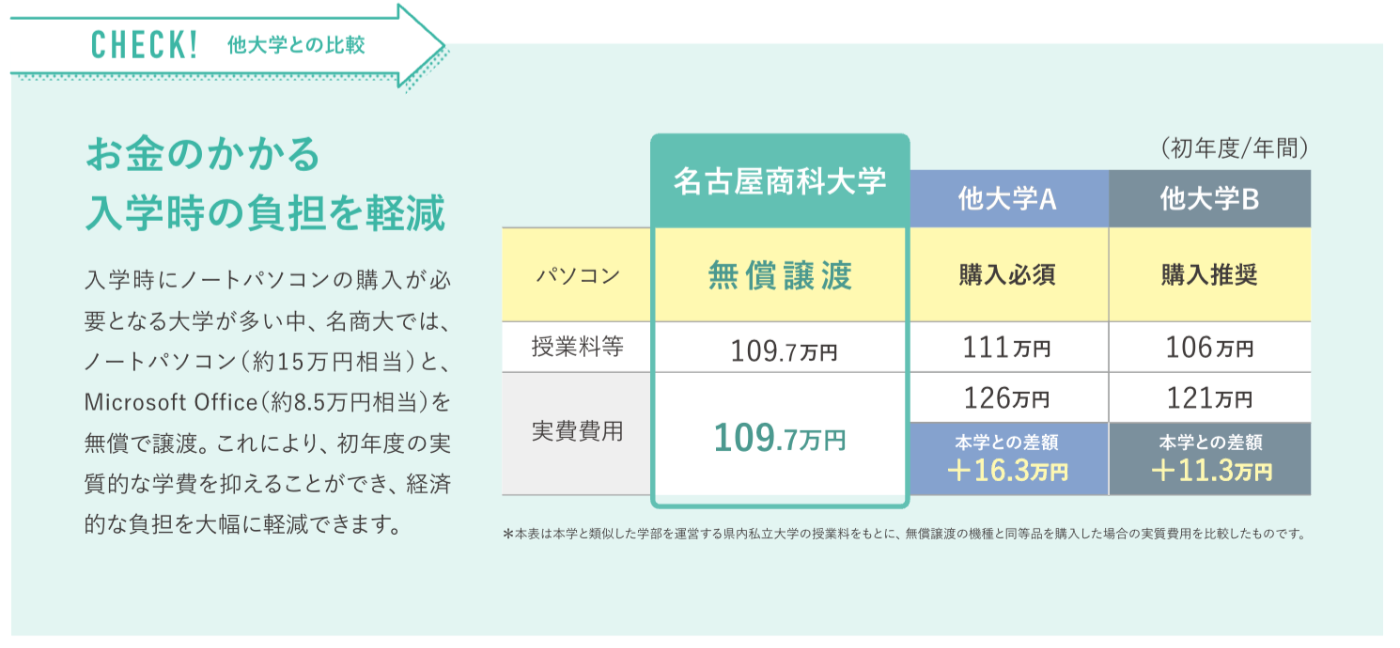 近年、多くの大学では入学時にノートパソコンの購入が必須または推奨されており、その費用は15万円前後に及ぶケースも少なくありません。さらに、レポート作成や授業で必要となるMicrosoft Officeなどのソフトウェア費用も学生・保護者の負担となっています。これに対し名古屋商科大学では、ノートパソコン本体に加え、学修に必要なソフトウェア環境を大学側で整備し、無償で提供することで、入学時に発生しがちな初期費用を大幅に軽減しています。その結果、本学では授業料等を含めた初年度の実質的な学費負担において、ノートパソコンを購入必須とする他大学と比較して、10万円以上の差が生じるケースもあります。教育の質を確保しながら家計への負担を抑える、本学ならではの支援制度です。