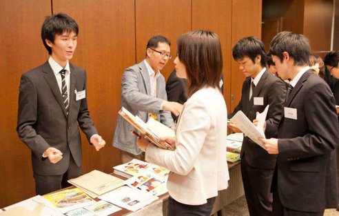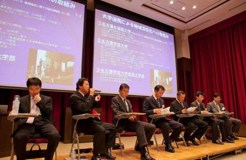 後半はパネル討論でした。いわゆる尾張東部地域にあたる尾張旭市、瀬戸市、長久手町、日進市、東郷町、豊明市の市町の職員の方々にご登壇いただき、現在における地域発展上の課題点や、大学との連携の現状と今後への期待を明らかにしていただきました。会場とのやりとりもあり、全体的に熱気に満ちた意見交換が行われました。もう一つ、今回のシンポジウムの目玉になったものは、就業力のプログラムで育った学生が登場した「展示発表」でした。上記の6市町のそれぞれの魅力を紹介する担当の学生チームが、各地域の固有の課題を学習するだけでなく、これに経済や商学や経営学等の学習成果も活用しながら、資料を作成し、これをテーブルブースに並べ、来場者に配布しながら対話をしました。まだまだ勉強を始めたばかりの学生たちですが、初々しく、一生懸命に自分たちの取組みを説明していました。