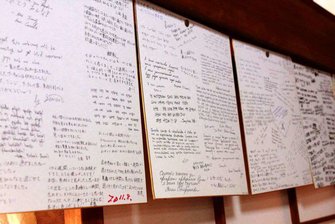 共同生活の場となる、東白川村「神田神社」神田殿には、これまでに参加した外国人ボランティアと本学学生が書いた寄せ書きが飾られています。国際ボランティアに参加したみんなの思いがこの色紙に込められています。