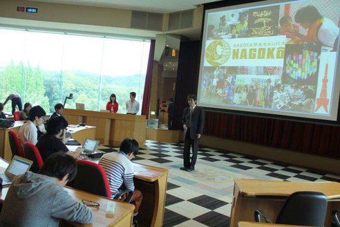 学生が集まる事のできる活動拠点をつくり、子供にない行動力と大人にない柔軟な発想力を持つ学生のアイデアとパワーを地域の活性化に活かすことを目標として活動しています。名古屋まつり等これまで様々な活動が新聞に取り上げられました。同じ大学生として学生はナゴ校に関して興味津々で、講義が終わった後も多くの学生がナゴ校でこんなことをしてはどうか、といった提案や、質問をする姿が見られました。