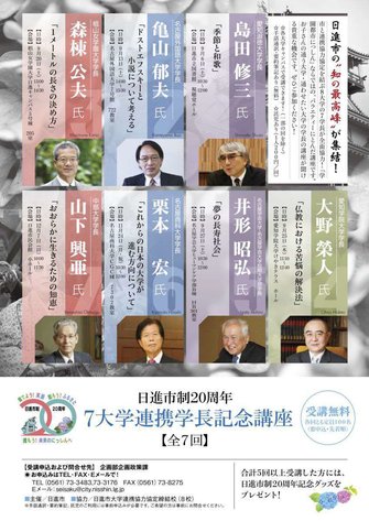 このたび「日進市制20周年記念事業 7大学連携学長記念講座(全7回)」が開催されることになりました。日進市と連携協力協定を結ぶ8大学の7学長が全面協力し、「学園都市にっしん」ならではのバラエティーにとんだ講座になります。