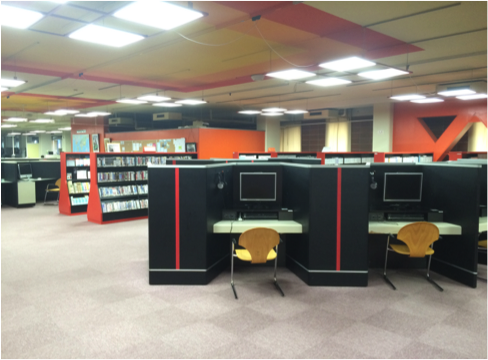 語学技能習得支援ツールが導入されたコンピュータが置かれており、本格的に英語の勉強を行うことができます。